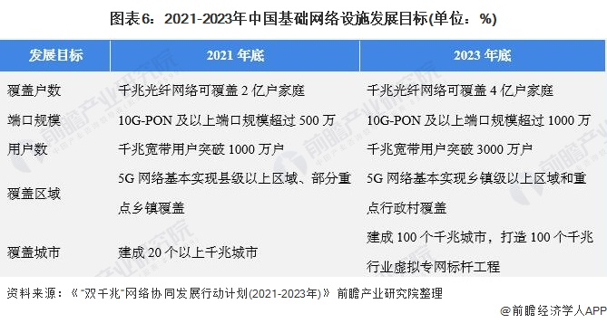 目前我国暂未制定专网通信具体发展目标,但在专网通信相关市场,如基础网络设施领域有相关发展目标。2021年3月工信部印发《“双千兆”网络协同发展行动计划(2021-2023年)》,指出到2021年底,建成20个以上千兆城市,2023年底实现“双百”目标。