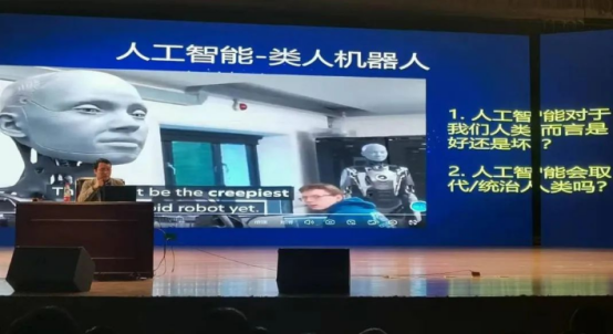 余博士从“人工智能”这个词的由来讲起,联系机器人的相关视频,深入浅出地归纳出了学界对于人工智能的定义:研究、开发用于模拟、延伸和扩展人的智能理论、方法、技术及应用系统的一门新的技术科学,是计算机科学的一个分支。对于人工智能的发展,他按时间顺序为学生梳理了清晰的脉络,余博士还重点讲解了人工智能的主要应用领域:包括机器人领域、语音识别领域、图像识别领域、专家系统等多方面,他还举例说明了人工智能的应用场景,包括AI运用于交通中帮助解决交通拥堵;AI与智能家居的融合,打造舒适宜环境;AI与医疗、体育、元宇宙、航天航空、教育等多领域的交叉融合,这些都传达给我们一个信息:人工智能的普及越来越常态化,人工智能与我们的生活息息相关。