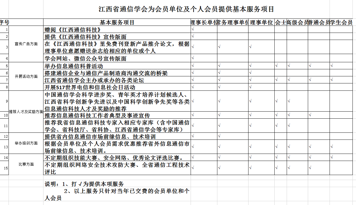 为规范江西省通信学会会员单位及个人会员的基本服务,经秘书处、各位理事审阅以及秘书长办公会研究决定对当年已交费的会员单位及个人会员提供如下基本服务项目(详见附件):