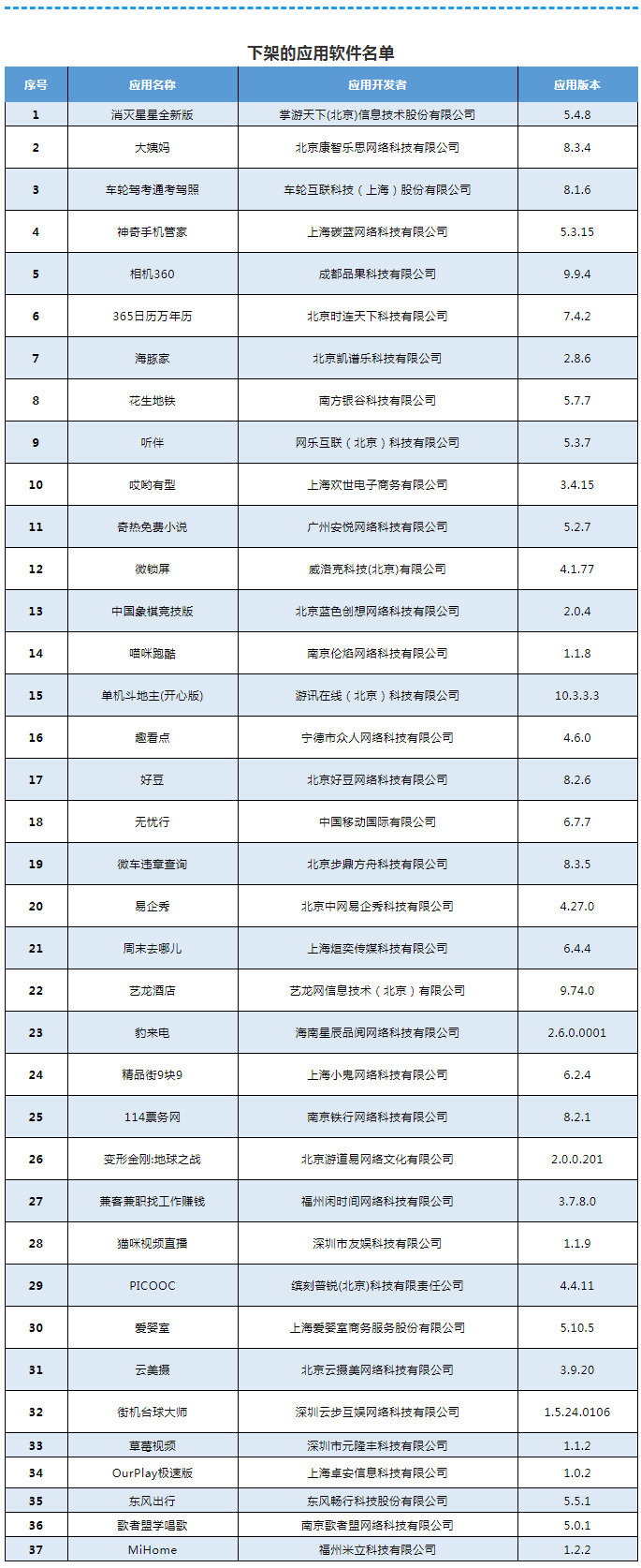 依据《网络安全法》和《移动智能终端应用软件预置和分发管理暂行规定》(工信部信管〔2016〕407号)等法律和规范性文件要求,我部组织对上述37款APP进行下架。相关应用商店应在本通报发布后,立即组织对名单中应用软件进行下架处理。
