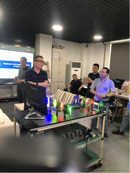 南昌大学可见光通信科研团队核心骨干余礼苏老师给考察团一行人重点科普讲解了何谓可见光通信以及网络融合架构下的可见光照明通信感知定位一体化技术。南昌大学可见光通信科研团队创建于2017年江风益院士领衔的国家“双一流”学科“新材料技术”交叉特色方向,团队以电子信息领域的“新材料、新器件、新系统和新领域”应用为研究主线,以新型照明传感通信定位一体化系统的产业化为目标,初步形成了多功能光电/射频综合传感及智能利用研究特色和系列创新成果,团队分别牵头或参与组建了教育部空间信息智能感知工程技术研究中心和江西省嵌入式系统工程技术研究中心。团队依托国家发改委仪器专项计划和学校资源构建了LED照明及通信感知与5G融合的测试装备和系统平台,包括可用于测试快时间响应和慢时间尺度性能指标的空域光分布测试系统、超快可见光光脉冲发生器、光谱仪和矢量网络分析仪为代表的测试装备。现有实验保障条件一方面具备射频综合实验室测试环境,例如波形参数测试、传输特性测试、动态信道测试、综合功能性检查等,进而提供无线通信系统技术指标的测试条件;另一方面具备可见光通信照明测试环境,可进行LED器件及可见光通信系统的照明、通信指标性能一体化测试与分析,支持电域和光域的耦合测试验证。此外,实验条件所建有的5G基带实验室测试环境可验证LED接入现有5G宏基站的能力,同时卫星信号模拟实验平台可验证基于LED的可见光定位接入现有GPS、GLONASS、北斗定位系统的能力。
