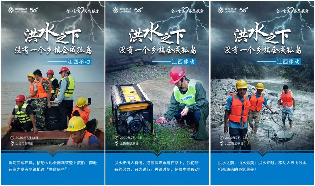 连日的暴雨使省内部分低洼地带出现了较严重的内涝现象,造成大面积故障断电,江西移动迅速布置数十处救灾应急服务点,充分发挥国企的社会职责与担当,辗转于各个灾情现场,妥善安置受灾群众。