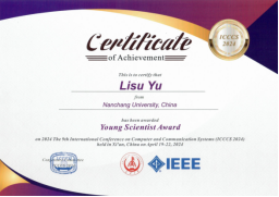 在4月19日至4月21日举行的IEEE支持、长安大学主办的第九届计算机与通信系统国际会议(ICCCS2024)上,余礼苏教授荣获“青年科学家奖”。由他指导的研究生张鸣莉在大会上分享了论文《Bit Error Rate Analysis of Visible Light Communication System Based on HDMA》,该论文提出了一种基于混合域多址接入(HDMA)技术的下行可见光通信系统,该系统融合了功率域、码域和频域等多域技术,旨在提升可见光通信的性能和效率。可见光通信团队王玉皞教授、王正海教授共同参与此项研究工作,团队研究生刘超良、张洛瑄、袁建威也参与研究。
