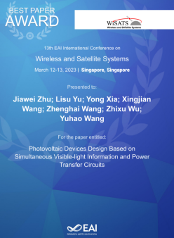 在新加坡科技设计大学主办的第13届无线与卫星系统国际会议(EAI WiSATS 2023)上,余礼苏教授指导的论文《Photovoltaic Devices Design Based on Simultaneous Visible-Light Information and Power Transfer Circuits》荣获“最佳论文奖”。课题组硕士研究生朱佳伟为该论文的第一作者,余礼苏教授和夏勇教授为共同通信作者,该论文的获奖展示了课题组在可见光通信领域探测器研究方面的科研创新实力。