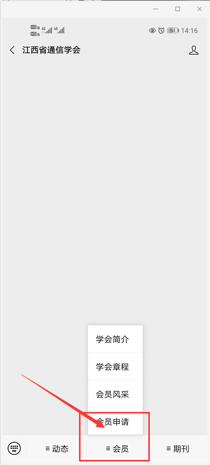 关注江西省通信学会微信公众号,在公众号对话框点击“会员”,进行会员申请操作。