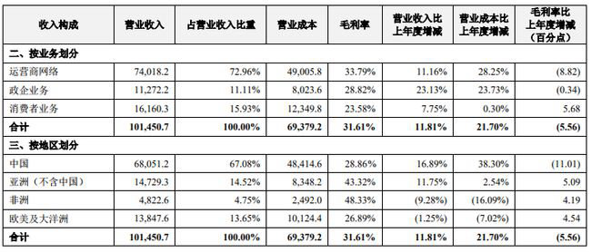 2020年,面对新冠疫情和外部环境的挑战,中兴通讯坚持聚焦主业,以技术创新为本,重视经营质量,积极推进业务拓展,进一步提升全球市场占有率。2020年,公司国内和国际市场营业收入均实现同比增长,其中国内市场营业收入同比增长16.9%至680.5亿元,国际市场营业收入同比增长2.7%至334.0亿元。在国内市场,公司紧抓5G、新基建发展机遇,实现市场格局和收入双提升;在国际市场,公司坚持健康经营,精耕价值市场,盈利能力不断提升,毛利率同比提升4.9个百分点至37.2%,为近十年最高。2020年,公司三大业务营业收入均实现同比增长,其中,运营商网络同比增长11.2%至740.2亿元,政企业务同比增长23.1%至112.7亿元,消费者业务同比增长7.8%至161.6亿元。